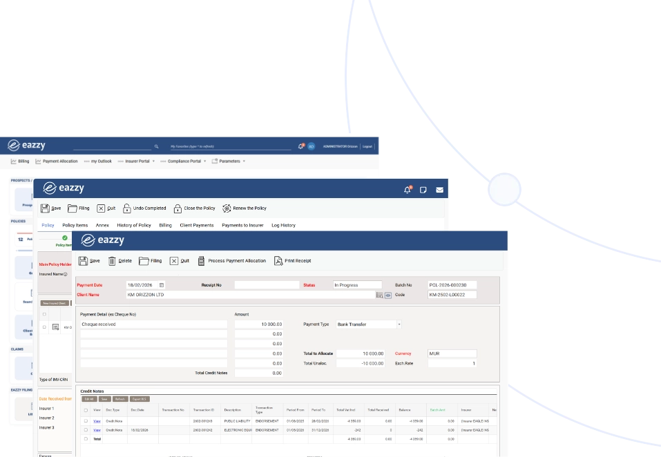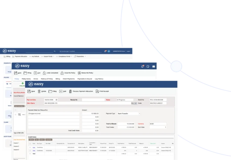 Proforma and Invoicing Management Module: By policy per client, by client with many policies, by group of companies with one or many invoices for one or several policies. With EAZZY you may also link invoices to your accounting software.